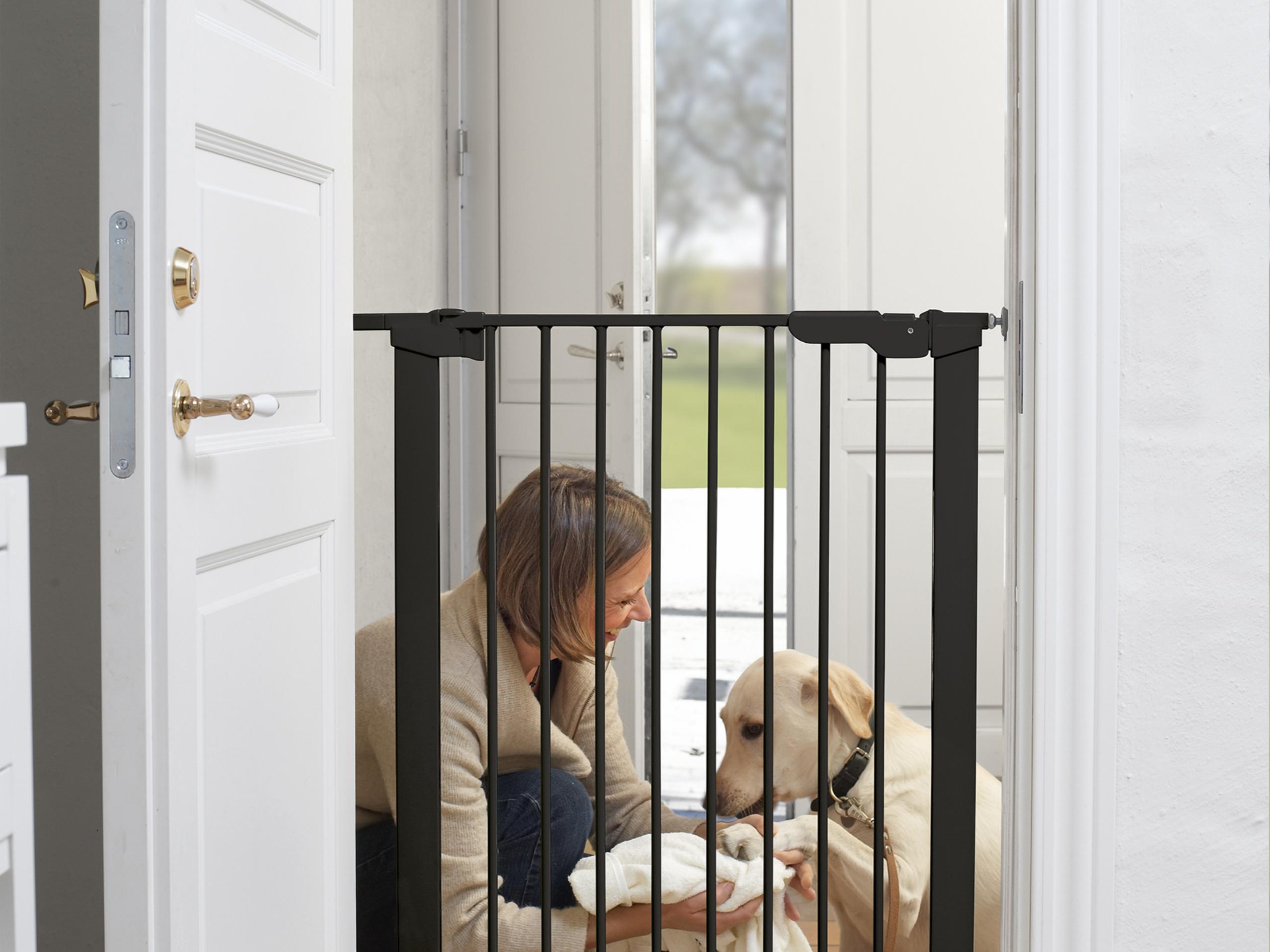 Hundegitteret kan også monteres i en døråbning, hvis du vil skabe et specifikt område til hunden. Du kan f.eks. montere et hundegitter i døren ind til bryggerset, hvis det skal være hundens rum. På den måde kan du holde den i bryggerset samtidig med, at den kan følge med i familiens gøremål.